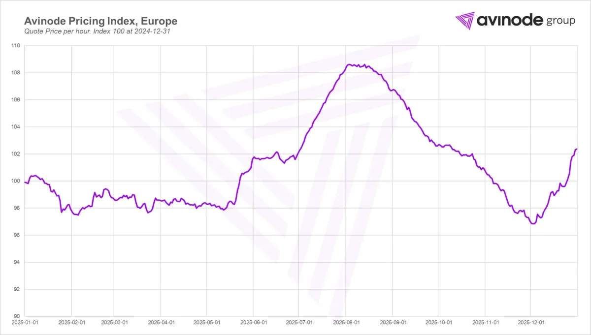 Last year, the European pricing index showed a stable first half of 2025, followed by a summer increase driven by seasonal demand, peaking around August. Prices trended downward through autumn before rising again ahead of the Christmas and New Year period.